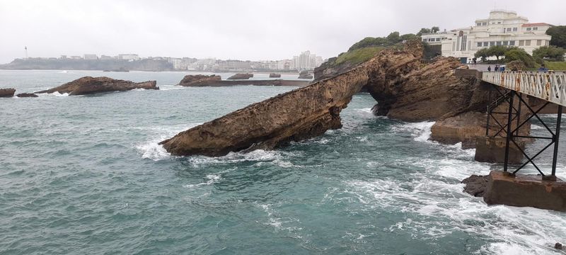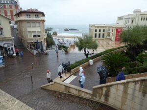 Le lendemain le départ est annoncé pour 8h30. Nous faisons la connaissance de notre guide, Isabelle. Visite très intéressante de Bayonne puis de Biarritz où nous déjeunons. La pluie nous tombe dessus dès la sortie du restaurant. Cela n’entame pas la volonté du groupe et nous entamons la découverte de Biarritz le long du bord de mer où s’activent des surfeurs. Bien trempés nous aussi mais d’une autre manière, nous regagnons le club de vacances après une halte à Arcangues où se trouve une très belle église visitée par certains courageux et le cimetière où repose Luis Mariano.