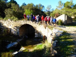La bonne quinzaine de marcheurs avalent tranquillement les 7 petits kilomètres et les 120 mètres de dénivelé, profitant de jolies vues sur le village, son église, et la plaine minervoise. Anciens ponts voûtés, bornes séculaires, murets et autres vestiges rappellent une histoire maintenant vieille, mais encore vivante. Nous sommes près de Minerve.