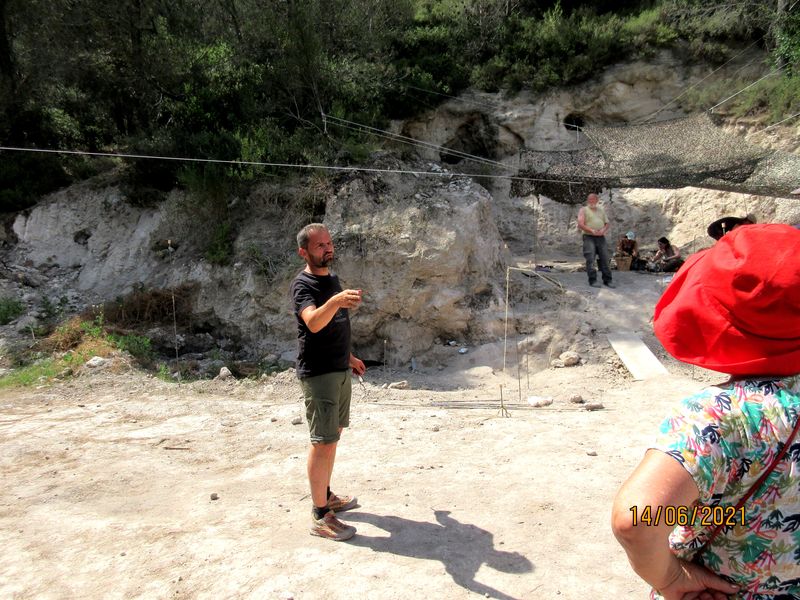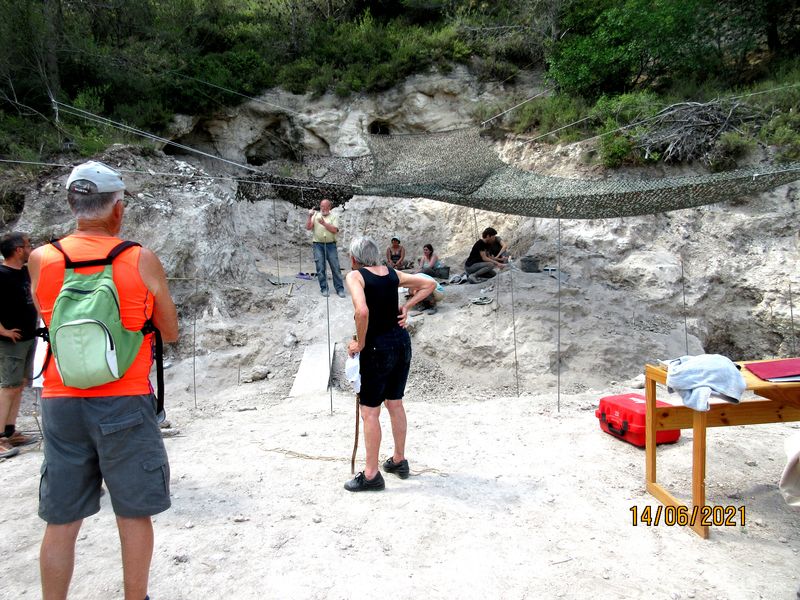 Certes, il faisait chaud, mais dans le bois de Sériège, nous ne peinâmes pas trop, pendant trois km. Il était temps, alors, de nous rendre sur le chantier de fouilles paléontologiques de Montouliers, où nous attendait l’équipe de chercheurs. Nous pûmes suivre les explications détaillées et savantes, tout en observant les ossements minutieusement dégagés, laissant espérer la découverte prochaine d’un hipparion (un lointain cousin du cheval) de 9 millions d’années ! Puis sur la route du retour, un diverticule nous conduit au sommet du mont Redon qui nous offre une vue gigantesque et magnifique sur notre beau pays.