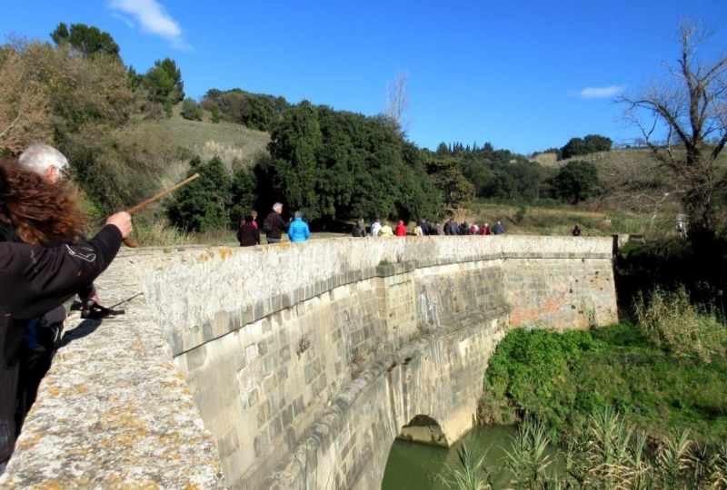 Arrivés au pont canal du Répudre notre ami fidèle Jean-Pierre avec de l’émotion dans sa voix commence à avoir une pensée pour notre ami Georges récemment disparu, s’occupant de la marche, reconnaissant les parcours, doté d’une gentillesse et d’un humour remarquables ; on ne peut oublier sa personne qui a longtemps marqué de son empreinte le Récantou de Bize. Puis c’est l’évocation du tout premier ouvrage d’art du Minervois ; c’est le plus vieux pont canal au monde ; en effet celui construit avant en Italie n’existe plus ; donc celui du Répudre est le doyen mondial. La construction de cet ouvrage a mobilisé 400 ouvriers pendant plus de quatre ans et a coûté une fortune, aussi cher que quatre écluses. Pour toutes ces précisions merci à Jean-Pierre que l’on a plaisir à écouter avec beaucoup d’attention. La marche se poursuit le long du chemin de halage jusqu’à Ventenac en passant devant les chênes chevelus qui au fil des saisons grandissent et s’étoffent malgré la sécheresse de cet été qui a freiné leur croissance.