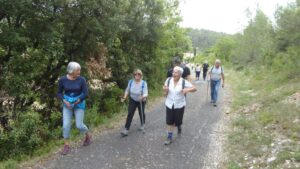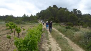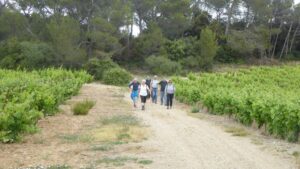 Notre petit groupe commence par un échauffement sur la route entre Paguignan et Cailhol, puis emprunte, à travers bois, une agréable piste qui le mènera aux abords de Vialanove. Nous longeons ensuite des vieilles vignes magnifiques nichées au creux de vallons isolés. Une petite grimpette dans de nouveaux bois nous fait arriver au-dessus de Paguignan, puis une dernière descente sur d’étroits chemins nous ramène sur la route. Retour aux véhicules après cette marche de 7,5 km, sous un temps agréable, malgré les craintes d’une météo délicate.